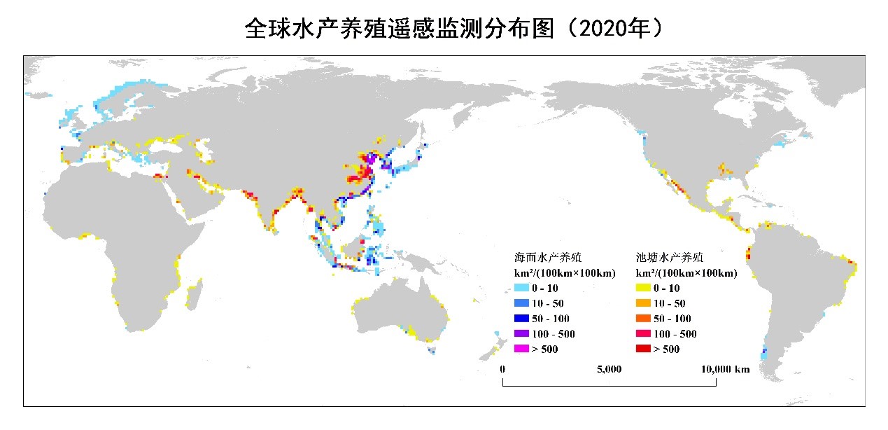 圖1 2020年全球水產養(yǎng)殖遙感監(jiān)測分布圖(海岸帶區(qū)域,百公里格網中海面水產養(yǎng)殖與池塘水產養(yǎng)殖同時存在時,僅對海面水產養(yǎng)殖進行顯示)