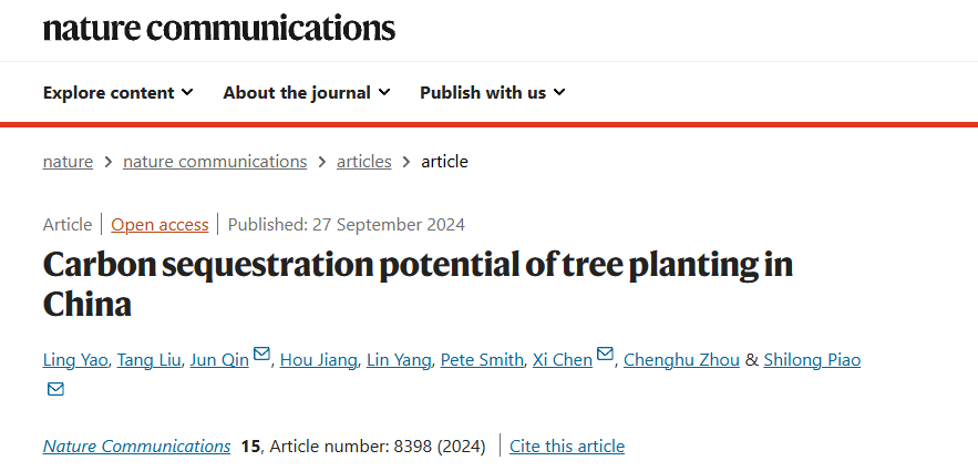 Yao L.ψ, Liu, T.ψ, Qin, J.*, Jiang H., Yang L., Smith P., Chen X.*, Zhou C. H., Piao S. L.*. Carbon sequestration potential of tree planting in China. Nature Communications 15, 8398 (2024). https://doi.org/10.1038/s41467-024-52785-6