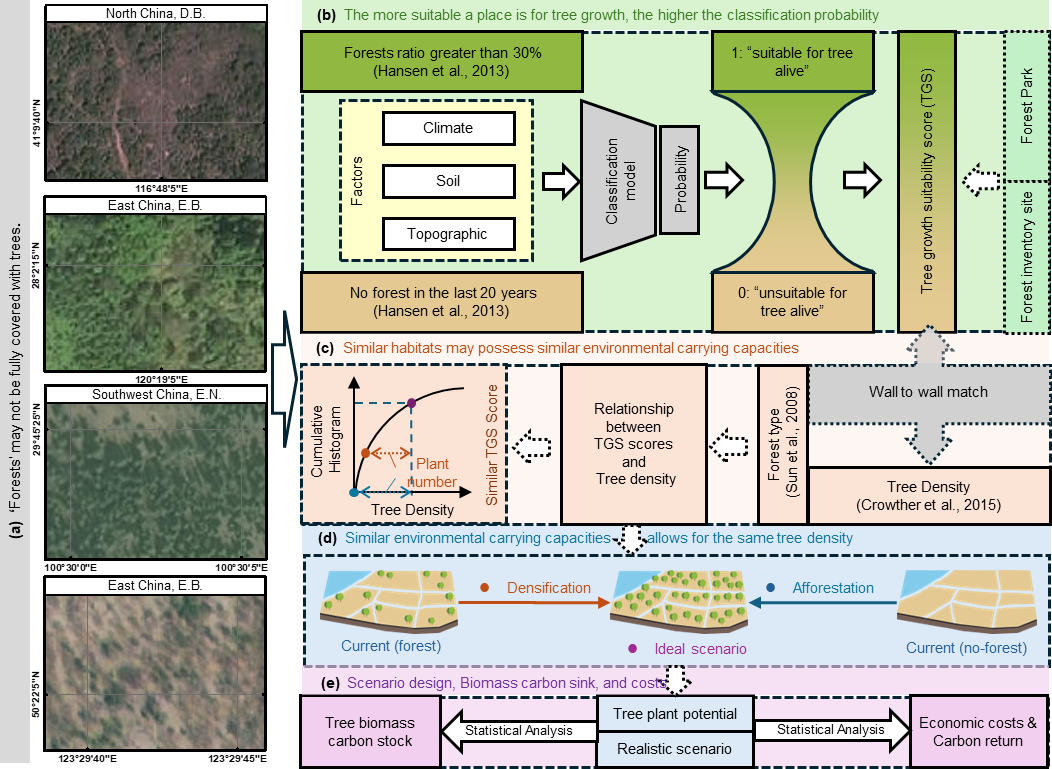 圖1:研究提出的植樹和碳匯潛力評估框架。(a)“森林”可能并未被樹木完全覆蓋;(b)樹木生長適宜性評價模型示意圖;(c)森林生長適宜性與樹木數(shù)量的關(guān)系統(tǒng)計模型,相似的生境條件可能存在相似的環(huán)境承載力;(d)造林策略可視化示意:相似的環(huán)境承載力與理想植樹場景;(e) 結(jié)合現(xiàn)行政策的場景設(shè)計與碳匯潛力估算。