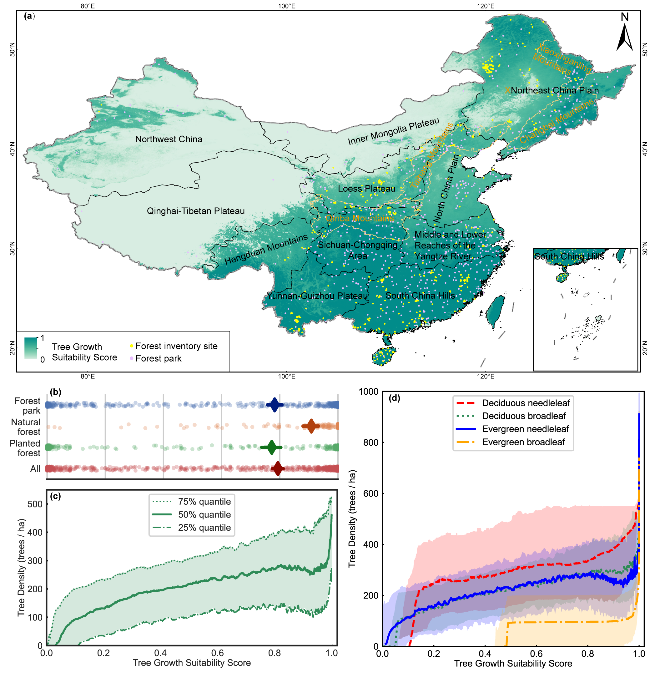 圖2:樹木生長適宜性(TGS)空間分布情況及其與樹木數(shù)量的定量關(guān)系。(a) TGS的空間分布模式及驗證點分布情況;(b) 不同類別林地的TGS驗證情況;(c) TGS與樹木密度之間的統(tǒng)計關(guān)系;(d) 不同森林類型樹木密度與TGS的統(tǒng)計關(guān)系
