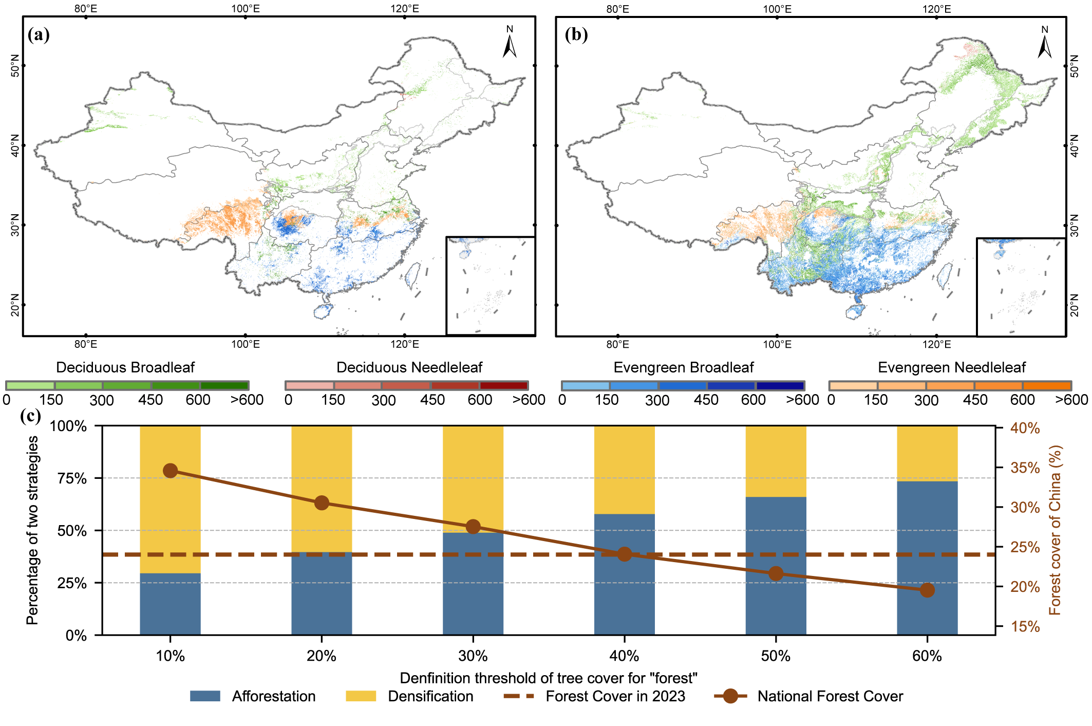 圖3:考慮現(xiàn)行生態(tài)政策的新增造林和加密造林的空間分布情況。(a)新增造林;(b) 加密造林;(c) 新增造林與加密造林的比例與森林定義閾值的關(guān)系
