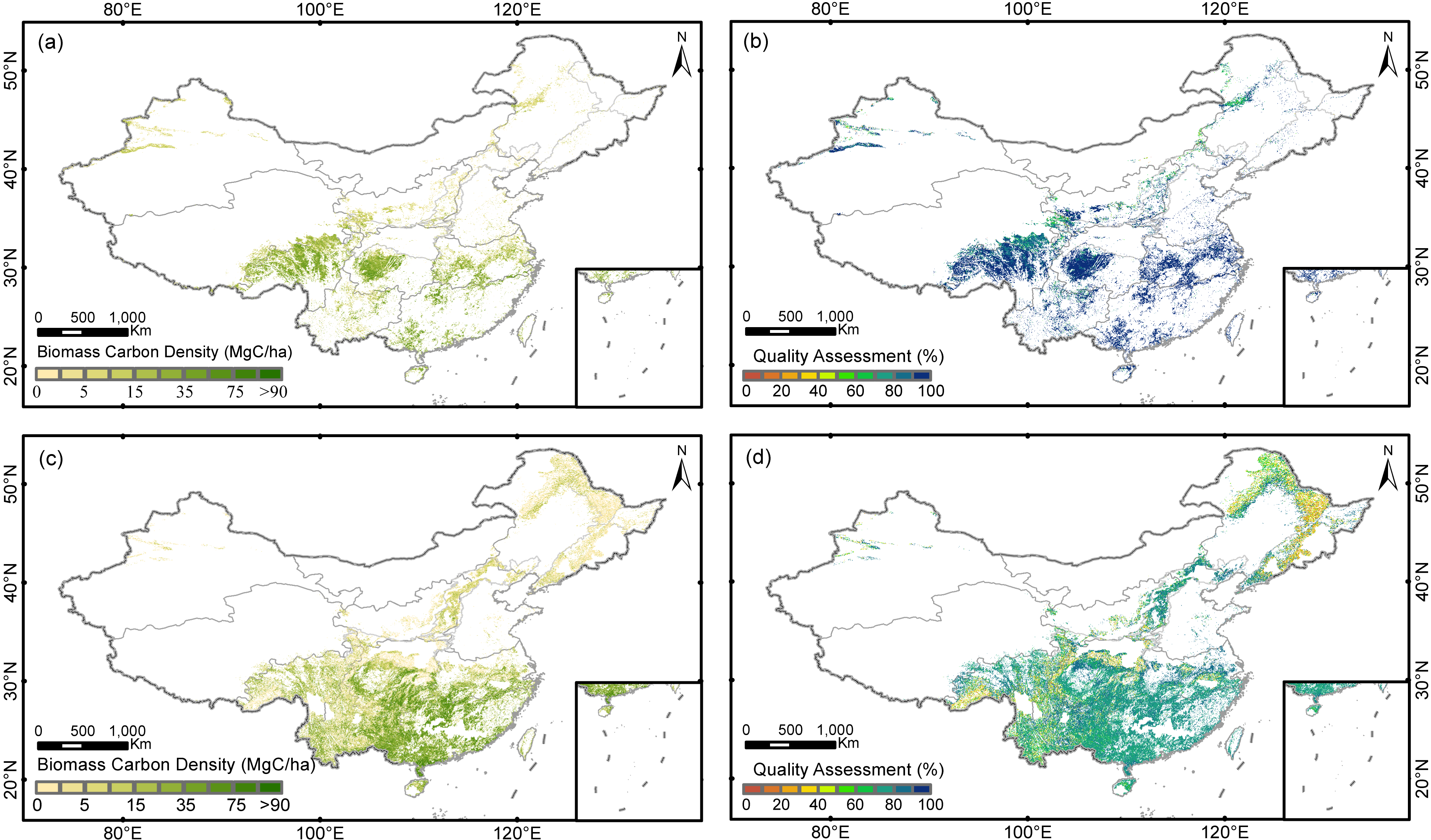 圖4:考慮現(xiàn)行生態(tài)政策的新增造林和加密造林的固碳潛力空間分布及其不確定性。(a-b)新增造林的固碳潛力空間分布及其不確定性。(c-d)加密造林的固碳潛力空間分布及其不確定性