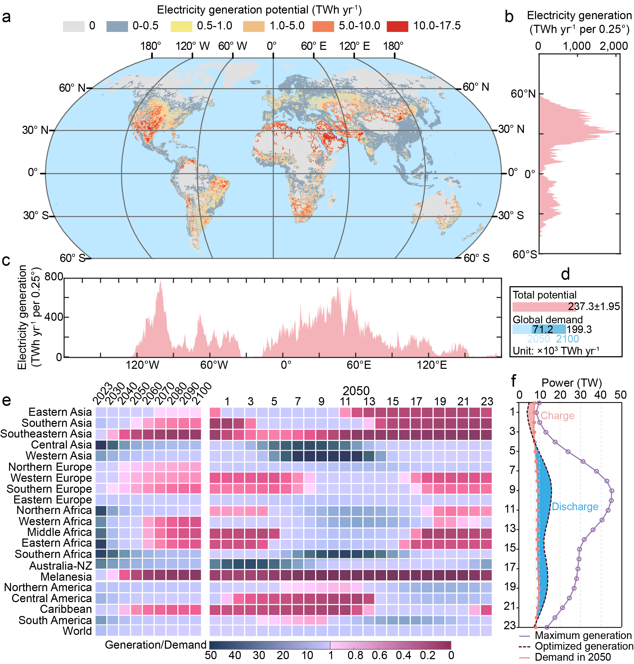 作者系統評估了全球互聯的太陽能-風能系統在滿足未來電力需求方面的可行性與效益。通過整合高分辨率空間(500?米)和時間(每小時)數據,全面評估了考慮太陽能和風能可開發性、可獲取性和互聯性的全球潛力。通過開發多目標空間優化框架,確定了具有成本效益和資源效率的互聯戰略,提供了有關太陽能-風能發電廠的空間分布與部署時間、儲能和輸電能力的區域分配,以及全球互聯的潛在效益和風險的寶貴見解。該工作推動了對全球能源互聯的更細致理解,并為實現這一愿景提供了具體的可參照的實現路徑。